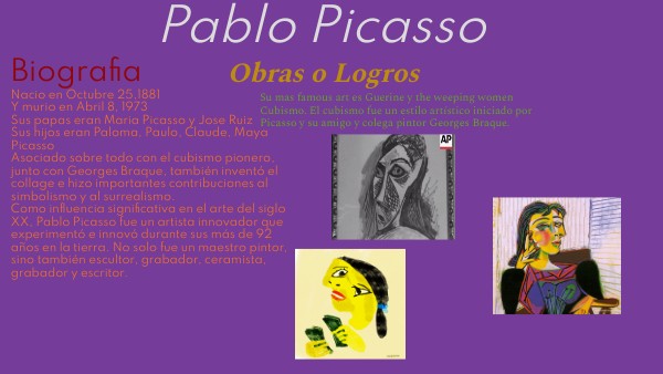 Nacio en Octubre 25,1881 Y murio en Abril 8, 1973 Sus papas eran Maria Picasso y Jose Ruiz Sus hijos eran Paloma, Paulo, Claude, Maya Picasso Asociado sobre todo con el cubismo pionero, junto con Georges Braque, también inventó el collage e hizo importantes contribuciones al simbolismo y al surrealismo. Como influencia significativa en el arte del siglo XX, Pablo Picasso fue un artista innovador que experimentó e innovó durante sus más de 92 años en la tierra. No solo fue un maestro pintor, sino también escultor, grabador, ceramista, grabador y escritor.