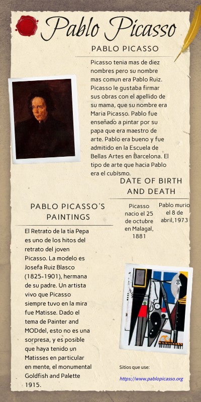Picasso tenia mas de diez nombres pero su nombre mas comun era Pablo Ruiz. Picasso le gustaba firmar sus obras con el apellido de su mama, que su nombre era Maria Picasso. Pablo fue enseñado a pintar por su papa que era maestro de arte. Pablo era bueno y fue admitido en la Escuela de Bellas Artes en Barcelona. El tipo de arte que hacia Pablo era el cubismo.