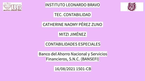 INSTITUTO LEONARDO BRAVO TEC. CONTABILIDAD CATHERINE NAOMY PÉREZ ZUNO MITZI JIMÉNEZ CONTABILIDADES ESPECIALES Banco del Ahorro Nacional y Servicios Financieros, S.N.C. (BANSEFI) 16/08/2021 1501-CB