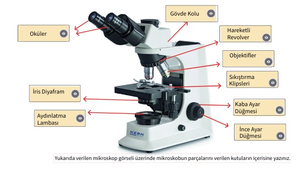 Yukarıda verilen mikroskop görseli üzerinde mikroskobun parçalarını verilen kutuların içerisine yazınız.