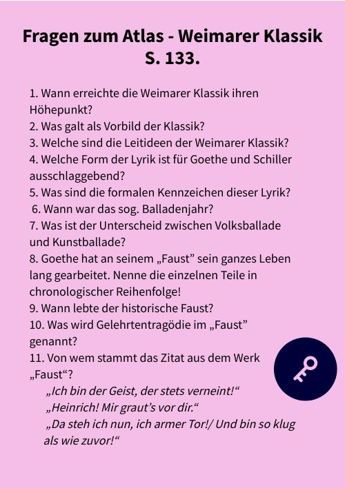 1. Wann erreichte die Weimarer Klassik ihren Höhepunkt? 2. Was galt als Vorbild der Klassik? 3. Welche sind die Leitideen der Weimarer Klassik? 4. Welche Form der Lyrik ist für Goethe und Schiller ausschlaggebend? 5. Was sind die formalen Kennzeichen dieser Lyrik? 6. Wann war das sog. Balladenjahr? 7. Was ist der Unterscheid zwischen Volksballade und Kunstballade? 8. Goethe hat an seinem „Faust” sein ganzes Leben lang gearbeitet. Nenne die einzelnen Teile in chronologischer Reihenfolge! 9. Wann lebte der historische Faust? 10. Was wird Gelehrtentragödie im „Faust” genannt? 11. Von wem stammt das Zitat aus dem Werk „Faust“? „Ich bin der Geist, der stets verneint!“ „Heinrich! Mir graut’s vor dir.“ „Da steh ich nun, ich armer Tor!/ Und bin so klug als wie zuvor!“