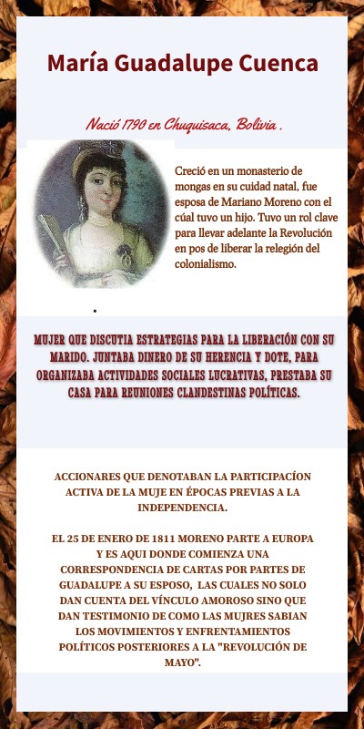 ACCIONARES QUE DENOTABAN LA PARTICIPACÍON ACTIVA DE LA MUJE EN ÉPOCAS PREVIAS A LA INDEPENDENCIA.EL 25 DE ENERO DE 1811 MORENO PARTE A EUROPA Y ES AQUI DONDE COMIENZA UNA CORRESPONDENCIA DE CARTAS POR PARTES DE GUADALUPE A SU ESPOSO, LAS CUALES NO SOLO DAN CUENTA DEL VÍNCULO AMOROSO SINO QUE DAN TESTIMONIO DE COMO LAS MUJRES SABIAN LOS MOVIMIENTOS Y ENFRENTAMIENTOS POLÍTICOS POSTERIORES A LA "REVOLUCIÓN DE MAYO".