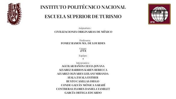 Civilizaciones Originarias de México FOMEZ RAMOS MA. DE LOURDES 1TV8 1 Aguilar Baños Cilvia JovanA Alvarez Barrios Karen RebeccA Alvarez Olivares Leilani MirandA Ayala Zavala EstheR Busto Casillas DiegO Conde Galván Mónica SarahÍ Contreras Flores Daniela YamileT García Ortega EduardO