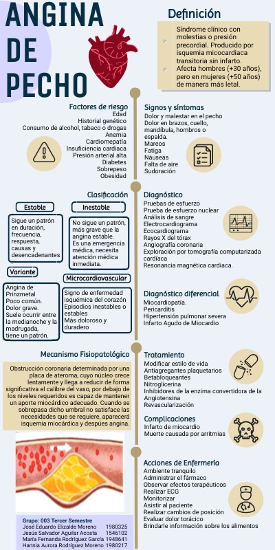 Síndrome clínico con molestias o presión precordial. Producido por isquemia micocardiaca transitoria sin infarto. Afecta hombres (+30 años), pero en mujeres (+50 años) de manera más letal.