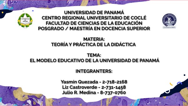 UNIVERSIDAD DE PANAMÁ CENTRO REGIONAL UNIVERSITARIO DE COCLÉ FACULTAD DE CIENCIAS DE LA EDUCACIÓN POSGRADO / MAESTRÍA EN DOCENCIA SUPERIOR MATERIA: TEORÍA Y PRÁCTICA DE LA DIDÁCTICA TEMA: EL MODELO EDUCATIVO DE LA UNIVERSIDAD DE PANAMÁ INTEGRANTERS: Yasmín Quezada - 2-718-2168 Liz Castroverde - 2-731-1458 Julio R. Medina - 8-737-0760