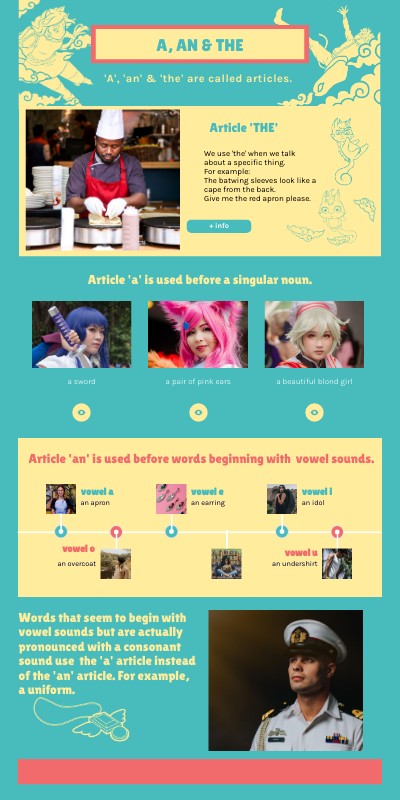 Words that seem to begin with vowel sounds but are actually pronounced with a consonant sound use the 'a' article instead of the 'an' article. For example, a uniform.