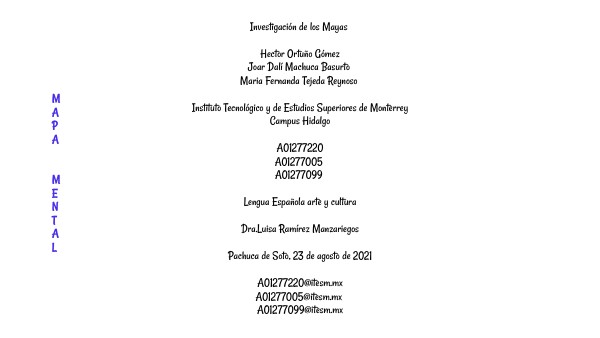 Investigación de los Mayas Hector Ortuño Gómez Joar Dalí Machuca Basurto Maria Fernanda Tejeda Reynoso Instituto Tecnológico y de Estudios Superiores de Monterrey Campus Hidalgo A01277220 A01277005 A01277099 Lengua Española arte y cultura Dra.Luisa Ramírez Manzariegos Pachuca de Soto, 23 de agosto de 2021 A01277220@itesm.mx A01277005@itesm.mx A01277099@itesm.mx