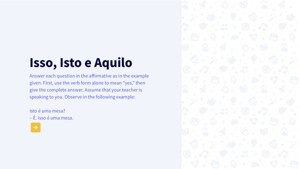 Answer each question in the affirmative as in the example given. First, use the verb form alone to mean “yes,” then give the complete answer. Assume that your teacher is speaking to you. Observe in the following example: Isto é uma mesa? – É. Isso é uma mesa.