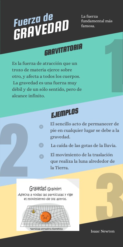 Es la fuerza de atracción que un trozo de materia ejerce sobre otro, y afecta a todos los cuerpos. La gravedad es una fuerza muy débil y de un sólo sentido, pero de alcance infinito.