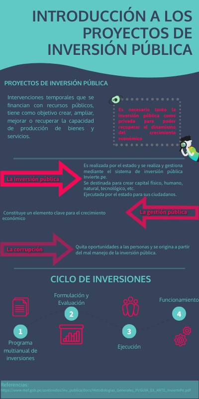 Es realizada por el estado y se realiza y gestiona mediante el sistema de inversión pública Invierte.pe.Se destinada para crear capital físico, humano, natural, tecnológico, etc. Ejecutada por el estado para sus ciudadanos.