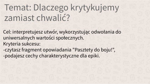 Cel: interpretujesz utwór, wykorzystując odwołania do uniwersalnych wartości społecznych.Kryteria sukcesu: -czytasz fragment opowiadania "Pasztety do boju!", -podajesz cechy charakterystyczne dla epiki.