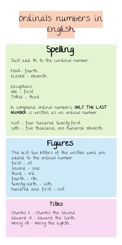 Just add th to the cardinal number:FOUR= fourth ELEVEN = eleventh Exceptions: ONE = first THREE = third In compound ordinal numbers, ONLY THE LAST NUMBER is written as an ordinal number: 421st = four hundred twenty-first 5,111th = five thousand, one hundred eleventh