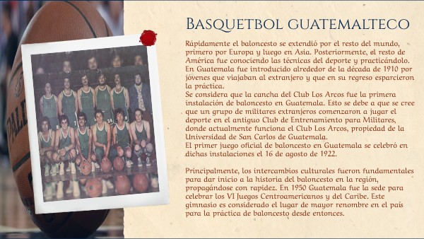 Rápidamente el baloncesto se extendió por el resto del mundo, primero por Europa y luego en Asia. Posteriormente, el resto de América fue conociendo las técnicas del deporte y practicándolo. En Guatemala fue introducido alrededor de la década de 1910 por jóvenes que viajaban al extranjero y que en su regreso esparcieron la práctica. Se considera que la cancha del Club Los Arcos fue la primera instalación de baloncesto en Guatemala. Esto se debe a que se cree que un grupo de militares extranjeros comenzaron a jugar el deporte en el antiguo Club de Entrenamiento para Militares, donde actualmente funciona el Club Los Arcos, propiedad de la Universidad de San Carlos de Guatemala. El primer juego oficial de baloncesto en Guatemala se celebró en dichas instalaciones el 16 de agosto de 1922. Principalmente, los intercambios culturales fueron fundamentales para dar inicio a la historia del baloncesto en la región, propagándose con rapidez. En 1950 Guatemala fue la sede para celebrar los VI Juegos Centroamericanos y del Caribe. Este gimnasio es considerado el lugar de mayor renombre en el país para la práctica de baloncesto desde entonces.