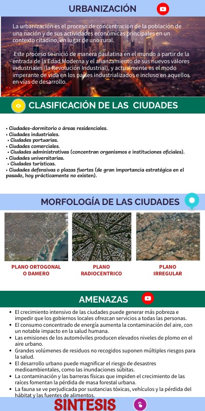 La urbanización es el proceso de concentración de la población de una nación y de sus actividades económicas principales en un contexto citadino, en lugar de uno rural. Este proceso se inició de manera paulatina en el mundo a partir de la entrada de la Edad Moderna y el afianzamiento de sus nuevos valores industriales (la Revolución Industrial), y actualmente es el modo imperante de vida en los países industrializados e incluso en aquellos en vías de desarrollo.