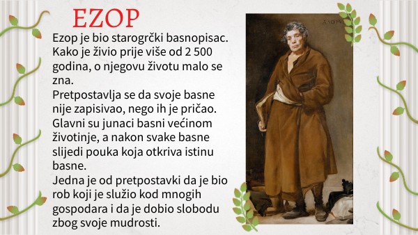 Ezop je bio starogrčki basnopisac.Kako je živio prije više od 2 500 godina, o njegovu životu malo se zna. Pretpostavlja se da svoje basne nije zapisivao, nego ih je pričao. Glavni su junaci basni većinom životinje, a nakon svake basne slijedi pouka koja otkriva istinu basne. Jedna je od pretpostavki da je bio rob koji je služio kod mnogih gospodara i da je dobio slobodu zbog svoje mudrosti.
