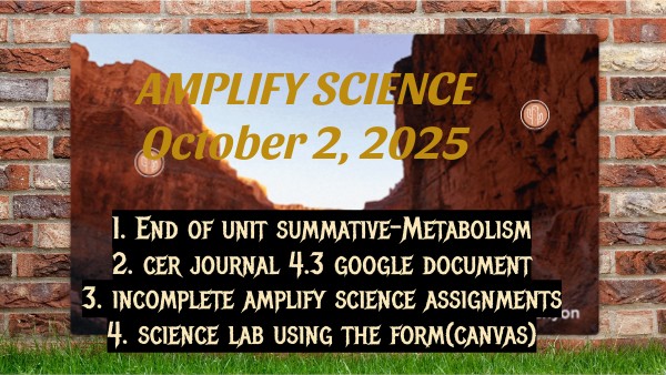 1. End of unit summative-Metabolism2. cer journal 4.3 google document 3. incomplete amplify science assignments 4. science lab using the form(canvas)