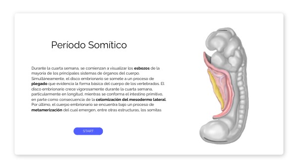 Durante la cuarta semana, se comienzan a visualizar los esbozos de la mayoría de los principales sistemas de órganos del cuerpo. Simultáneamente, el disco embrionario se somete a un proceso de plegado que evidencia la forma básica del cuerpo de los vertebrados. El disco embrionario crece vigorosamente durante la cuarta semana, particularmente en longitud, mientras se conforma el intestino primitivo, en parte como consecuencia de la celomización del mesodermo lateral. Por último, el cuerpo embrionario se encuentra bajo un proceso de metamerización del cual emergen, entre otras estructuras, los somitas