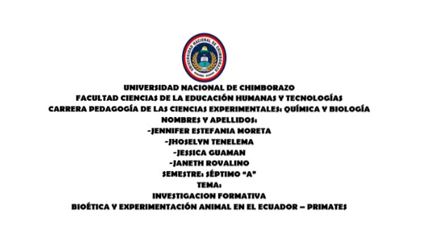 Campos, F. (09 de Julio de 2019). Aspectos bioéticos de la experimentación animal. Recuperado de https://www.conicyt.cl/fondecyt/files/2012/10/Libro-4-Aspectos-Bio%C3%A9ticos-de-la-Experimentaci%C3%B3n-Animal.pdf Garces, F. (2018). Bioética en la experimentación con animales. Revista Espacios, ISSN 0798 1015 Vol. 39 (Nº 16) 03-04. Recuperado de https://www.revistaespacios.com/a18v39n16/a18v39n16p43.pdf López, A., & Martínez, M. (23 de Febrero de 2019). Primates en laboratorios. Recuperado de https://www.petalatino.com/sobre/nuestros-temas/los-animales-no-son-nuestros-para-usarlos-en-experimentos/primates-en-laboratorios/ Martínez, M. (22 de Septiembre de 2019). Debate sobre la experimentación animal. Recuperado de https://ellipse.prbb.org/es/debate-sobre-la-experimentacion-animal/ Morales, M. (12 de Junio de 2019). Primates no humanos en investigación y pruebas de seguridad. Recuperado de https://ec.europa.eu/health/scientific_committees/opinions_layman/es/primates-no-humanos/index.htm Veloz, C. (13 de Abril de 2019). Primates no humanos en investigación y pruebas de seguridad. Recuperado de https://copublications.greenfacts.org/es/primates-no-humanos/index.htm Kimber. (24 de 07 de 2019). Bioética y experimentación animal en el Ecuador. Obtenido de https://ddd.uab.cat/pub/trerecpro/2011/85719/bioexpani.pdf Russell. (15 de 08 de 2018). Bioética y experimentación animal en el Ecuador. Obtenido de http://www.scielo.org.pe/scielo.php?script=sci_arttext&pid=S1726-46342016000200015