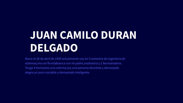 Nacio el 28 de abril de 1999 actualmente voy en 5 semestre de ingenieria de sistemas,vivo en floridablanca con mi padre,madrastra y 2 hermanastros. Tengo 4 hermanos una sobrina,soy una persona divertida y demasiado alegre,un poco sociable y demasiado inteligente.
