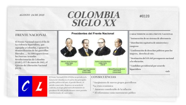 El Frente Nacional marcó el fin de La violencia bipartidista, que aquejaba a Colombia, y generó la desmovilización de las guerrillas liberales. ... En 1964 aparecieron las Fuerzas Armadas Revolucionarias de Colombia (FARC). El 7 de enero de 1965, el Ejército de Liberación Nacional (ELN).