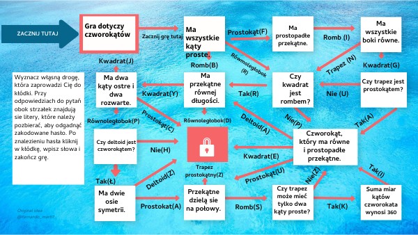 Wyznacz włąsną drogę, która zaprowadzi Cię do kłódki. Przy odpowiedziach do pytań obok strzałek znajdują sie litery, które należy pozbierać, aby odgadnąć zakodowane hasło. Po znalezieniu hasła kliknij w kłódkę, wpisz słowa i zakończ grę.