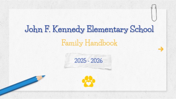 Dear JFK Families,Welcome to the 2025–2026 school year! I am absolutely thrilled to begin another year at JFK, and I can’t wait to welcome our students back to school on Wednesday, September 3rd. I hope their summer was filled with plenty of rest, adventure, and joyful memories. As we get ready for another year of learning and growing together, I encourage you to take a few moments to review the information in this handbook. While many routines and policies remain the same, you’ll also find some important updates to help ensure a safe, happy, and successful year for all. We’re excited to continue our tradition of kicking off the year with a First Day of School Celebration on the blacktop at 8:45 AM. We’ll have music, bubbles, and lots of smiles as families cheer students on as they march into the building. Kindergarten families are welcome to walk their children to class; families of students in other grades, we ask that you say your goodbyes outside. If you have any questions as you read through the handbook or prepare for the first day, please don’t hesitate to reach out via email or Teams. We're here to help every step of the way. I’m looking forward to a year full of learning, laughter, growth, and “pawsitivity”! Please give your children a big hello from me—and let them know I can’t wait to see them soon! With love, Ms. Jamieson Principal