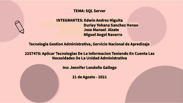 TEMA: SQL Server INTEGRANTES: Edwin Andres Higuita Durley Yohana Sanchez Henao Jose Manuel Alzate Miguel Angel Navarro Tecnologia Gestion Administrativa, Servicio Nacional de Apredizaje 2257470: Aplicar Tecnologias De La Informacion Teniendo En Cuenta Las Necesidades De La Unidad Administrativa Ins: Jennifer Londoño Gallego 21 de Agosto - 2021