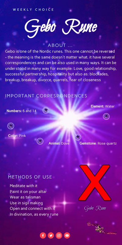 Gebo is one of the Nordic runes. This one cannot be reversed - the meaning is the same doesn't matter what. it have several correspondences and can be also used in many ways. It can be understood in many way for example: Love, good relationship, successful partnership, hospitality but also as: blockades, breakup, breakup, divorce, quarrels, fear of closeness