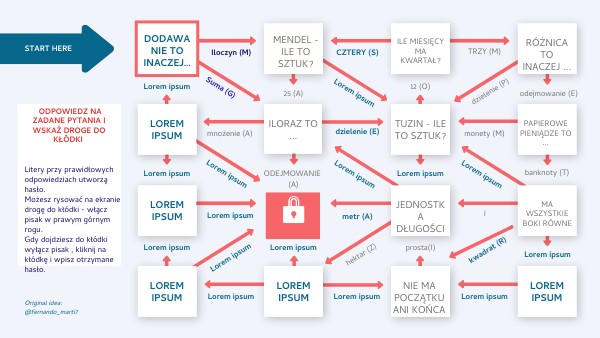 Litery przy prawidłowych odpowiedziach utworzą hasło. Możesz rysować na ekranie drogę do kłódki - włącz pisak w prawym górnym rogu. Gdy dojdziesz do kłódki wyłącz pisak , kliknij na kłódkę i wpisz otrzymane hasło.