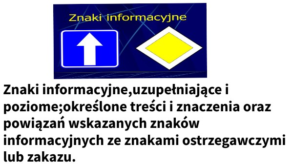 Znaki informacyjne,uzupełniające i poziome;określone treści i znaczenia oraz powiązań wskazanych znaków informacyjnych ze znakami ostrzegawczymi lub zakazu.