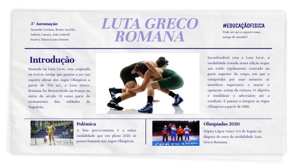 Inconfundível com a Luta Livre, a modalidade tratada nesta edição segue um estilo rigidamente centrado na parte superior do corpo, em que o competidor por usar somente os membros superiores e atacar o oponente acima da cintura. O objetivo é imobilizar o adversário até a rendição. E passou a integrar os Jogos Olímpicos a partir de 1896.