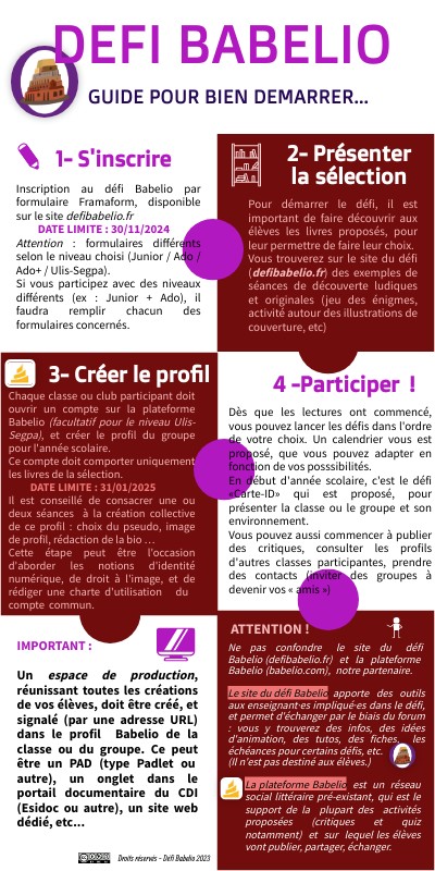 Ne pas confondre le site du défi Babelio (defibabelio.fr) et la plateforme Babelio (babelio.com), notre partenaire. Le site du défi Babelio apporte des outils aux enseignant·es impliqué·es dans le défi, et permet d'échanger par le biais du forum : vous y trouverez des infos, des idées d'animation, des tutos, des fiches, les échéances pour certains défis, etc. (Il n'est pas destiné aux élèves.)