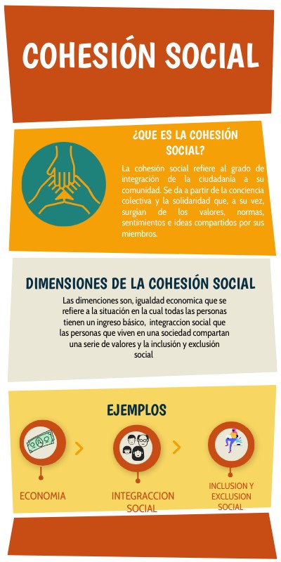 La cohesión social refiere al grado de integración de la ciudadanía a su comunidad. Se da a partir de la conciencia colectiva y la solidaridad que, a su vez, surgían de los valores, normas, sentimientos e ideas compartidos por sus miembros.