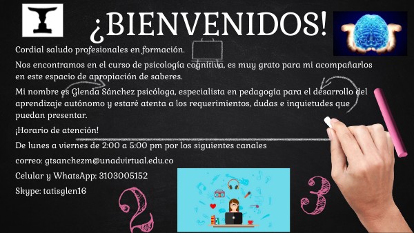 Cordial saludo profesionales en formación. Nos encontramos en el curso de psicología cognitiva, es muy grato para mi acompañarlos en este espacio de apropiación de saberes. Mi nombre es Glenda Sánchez psicóloga, especialista en pedagogía para el desarrollo del aprendizaje autónomo y estaré atenta a los requerimientos, dudas e inquietudes que puedan presentar. ¡Horario de atención! De lunes a viernes de 2:00 a 5:00 pm por los siguientes canales correo: gtsanchezm@unadvirtual.edu.co Celular y WhatsApp: 3103005152 Skype: tatisglen16