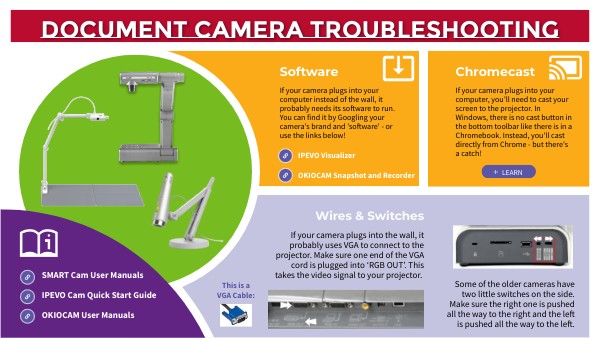 If your camera plugs into your computer, you’ll need to cast your screen to the projector. In Windows, there is no cast button in the bottom toolbar like there is in a Chromebook. Instead, you'll cast directly from Chrome - but there's a catch!