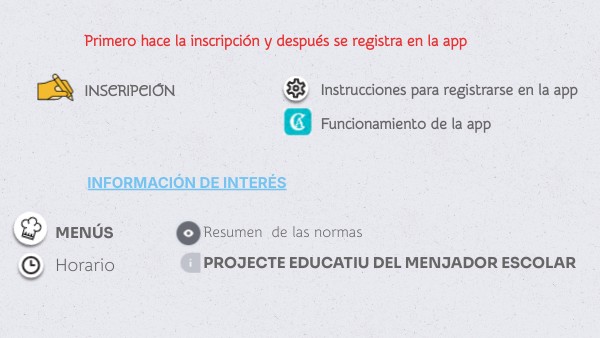 MENÚSEls menús basals (normals) els podeu trobar a l'app de colevisa. Ací sols apareixen els menús especials. Los menús basales (normales) los podéis encontrar en la app de colevisa. Aquí solo aparecen los menús especiales.