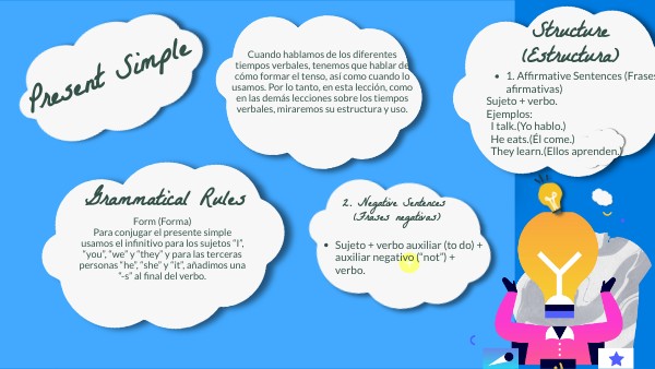 1. El presente simple se utiliza para hablar de cosas que suceden habitualmente. A diferencia con el español, no se usa el presente simple para hablar sobre algo que está pasando en el momento en el que hablamos.