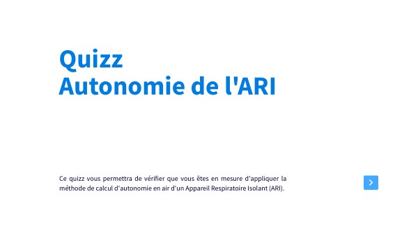 Ce quizz vous permettra de vérifier que vous êtes en mesure d'appliquer la méthode de calcul d'autonomie en air d'un Appareil Respiratoire Isolant (ARI).