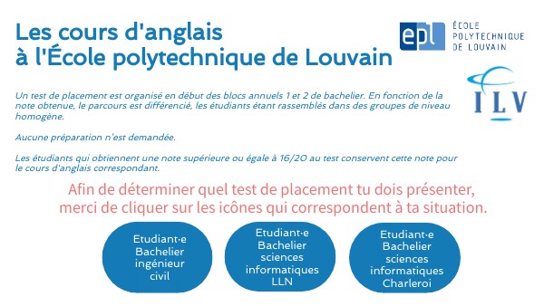 Un test de placement est organisé en début des blocs annuels 1 et 2 de bachelier. En fonction de la note obtenue, le parcours est différencié, les étudiants étant rassemblés dans des groupes de niveau homogène. Aucune préparation n’est demandée. Les étudiants qui obtiennent une note supérieure ou égale à 16/20 au test conservent cette note pour le cours d'anglais correspondant.
