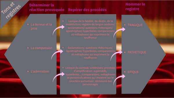 - Lexique de la fatalité, du destin, de la malédiction/ registre de langue soutenu/ exclamations/ questions rhétoriques/ apostrophes/ hyperboles, comparaisons et métaphores qui expriment la souffrance