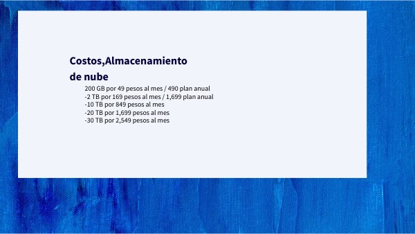 200 GB por 49 pesos al mes / 490 plan anual-2 TB por 169 pesos al mes / 1,699 plan anual-10 TB por 849 pesos al mes -20 TB por 1,699 pesos al mes -30 TB por 2,549 pesos al mes