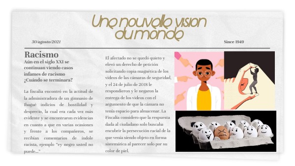 En pleno siglo XXI se continúan viendo situaciones de racismo, en donde te asesinan o pasan por encima de ti, tan sólo por tu color de piel ¿Acaso hemos perdido la cordura? Bueno…hace años, hace siglos hemos perdido la cordura, incluso me sorprende que aún estemos en este mundo, con nuestra falta de carácter y el deseo que tenemos de hacer daño a los demás, pisotearlos como si fueran cucarachas despreciables con vidas miserables, cuando son humanos que sienten, que tienen alma y corazón, el suceso de que se tenga un color diferente de piel, no implica que no se tengan ambiciones, deseos, emociones, sentimientos y todo lo que puede sentir, pensar o actuar como una persona “normal”
