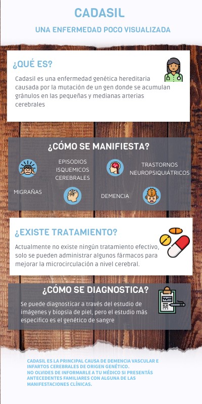 CADASIL es la principal causa de demencia vascular e infartos cerebrales de origen genético.No olvides de informarle a tu médico si presentás antecedentes familiares con alguna de las manifestaciones clínicas.