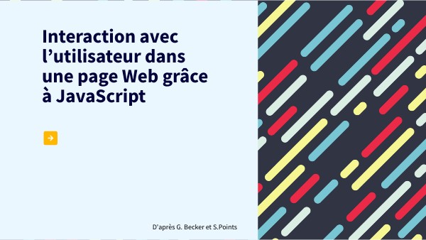 • Lors de la navigation sur le Web, les internautes interagissent avec leur machine par le biais des pages Web. • L’Interface Homme-Machine (IHM) repose sur la gestion d’événements associés à des éléments graphiques munis de méthodes algorithmiques. • Un événement est une action qui se produit, comme un clic sur un bouton (click), le survol d’un lément avec la souris (mouseover), etc. • On peut « écouter » un événement pour détecter lorsqu’il se produit et on peut lui « répondre » en lui associant un code qui va s’exécuter dès qu’il se produit. • Le langage JavaScript, associé au HTML, permet d’implémenter la gestion de ces événements en utilisant ce qu’on appelle un gestionnaire d’événement. • Aujourd’hui, on recommande d’utiliser la méthode addEventListener pour gérer les événements.