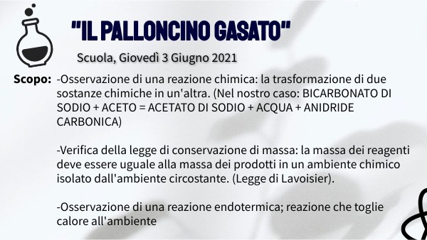 -Osservazione di una reazione chimica: la trasformazione di due sostanze chimiche in un'altra. (Nel nostro caso: BICARBONATO DI SODIO + ACETO = ACETATO DI SODIO + ACQUA + ANIDRIDE CARBONICA) -Verifica della legge di conservazione di massa: la massa dei reagenti deve essere uguale alla massa dei prodotti in un ambiente chimico isolato dall'ambiente circostante. (Legge di Lavoisier). -Osservazione di una reazione endotermica; reazione che toglie calore all'ambiente