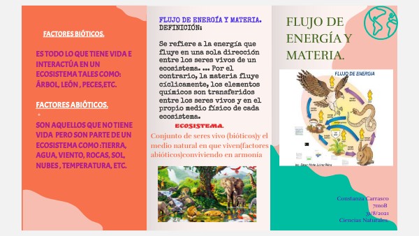 FLUJO DE ENERGÍA Y MATERIA.DEFINICIÓN: Se refiere a la energía que fluye en una sola dirección entre los seres vivos de un ecosistema. ... Por el contrario, la materia fluye cíclicamente, los elementos químicos son transferidos entre los seres vivos y en el propio medio físico de cada ecosistema.