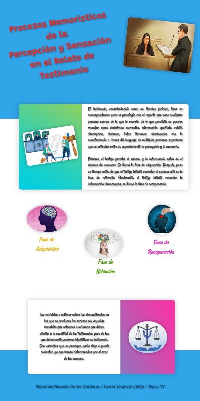 El testimonio, considerándolo como un término jurídico, tiene su correspondencia para la psicología con el reporte que hace cualquier persona acerca de lo que le ocurrió, de lo que percibió; se pueden manejar como sinónimos: narración, información aportada, relato, descripción, discurso, todos términos relacionados con la manifestación a través del lenguaje de múltiples procesos superiores que se articulan entre sí, especialmente la percepción y la memoria. Primero, el testigo percibe el suceso, y la información entra en el sistema de memoria. Se llama la fase de adquisición. Después, pasa un tiempo antes de que el testigo intente recordar el suceso; esto es la fase de retención. Finalmente, el testigo intenta recordar la información almacenada; se llama la fase de recuperación