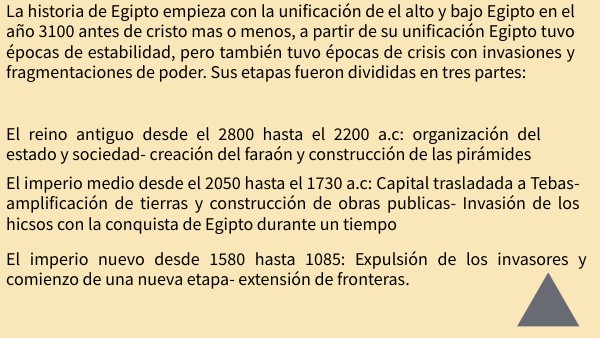 La historia de Egipto empieza con la unificación de el alto y bajo Egipto en el año 3100 antes de cristo mas o menos, a partir de su unificación Egipto tuvo épocas de estabilidad, pero también tuvo épocas de crisis con invasiones y fragmentaciones de poder. Sus etapas fueron divididas en tres partes: