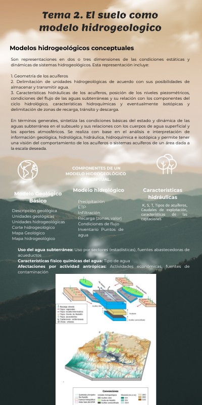 Son representaciones en dos o tres dimensiones de las condiciones estáticas y dinámicas de sistemas hidrogeológicos. Esta representación incluye: 1. Geometría de los acuíferos 2. Delimitación de unidades hidrogeológicas de acuerdo con sus posibilidades de almacenar y transmitir agua. 3. Características hidráulicas de los acuíferos, posición de los niveles piezométricos, condiciones del flujo de las aguas subterráneas y su relación con los componentes del ciclo hidrológico, características hidroquímicas y eventualmente isotópicas y delimitación de zonas de recarga, tránsito y descarga. En términos generales, sintetiza las condiciones básicas del estado y dinámica de las aguas subterránea en el subsuelo y sus relaciones con los cuerpos de agua superficial y los aportes atmosféricos. Se realiza con base en el análisis e interpretación de información geológica, hidrológica, hidráulica, hidroquímica e isotópica y permite tener una visión del comportamiento de los acuíferos o sistemas acuíferos de un área dada a la escala deseada.