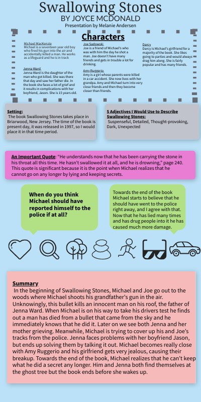 Summary In the beginning of Swallowing Stones, Michael and Joe go out to the woods where Michael shoots his grandfather's gun in the air. Unknowingly, this bullet kills an innocent man on his roof, the father of Jenna Ward. When Michael is on his way to take his drivers test he finds out a man has died from a bullet that came from the sky and he immediately knows that he did it. Later on we see both Jenna and her mother grieving. Meanwhile, Michael is trying to cover up his and Joe’s tracks from the police. Jenna faces problems with her boyfriend Jason, but ends up solving them by talking it out. Michael becomes really close with Amy Ruggerio and his girlfriend gets very jealous, causing their breakup. Towards the end of the book, Michael realizes that he can’t keep what he did a secret any longer. Him and Jenna both find themselves at the ghost tree but the book ends before she wakes up.